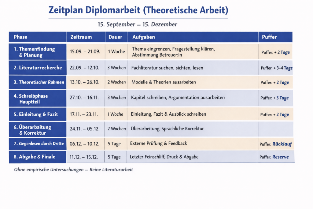 Auch sinnvoll ist ein Zeitplan, in dem man etappenweise festlegt, wann man mit welchem Schritt fertig sein möchte. Das Wichtigste hierbei sind Pufferzeiten, denn es wird sehr wahrscheinlich nicht genau so aufgehen, wie man es geplant oder sich gewünscht hat. Dann ist es gut, wenn noch etwas zusätzliche Zeit vorhanden ist.
